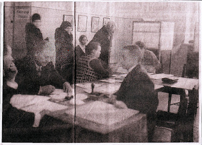 kahdenvärisiä äänestyslippuja. Vielä oli sanomalehtileike, jossa oli kuva